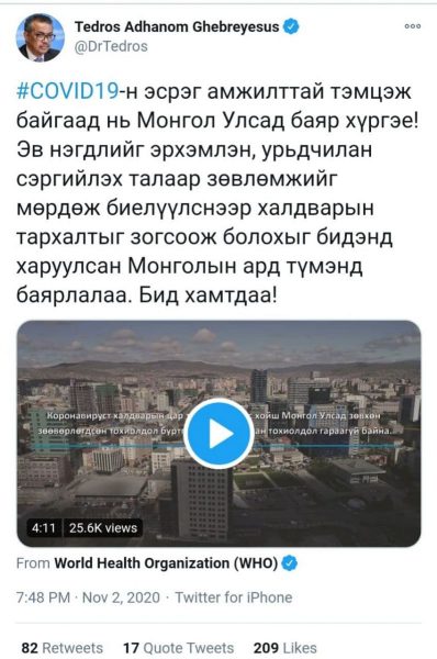 ДЭМБ-ын Ерөнхий захирал Др Тедрос Адханом Гебрейсус Монголын ард түмэн (COVID-19) халдварыг дотооддоо тархахаас сэргийлэх ажлыг амжилттай зохион байгуулж байгаад баяр хүргэлээ.