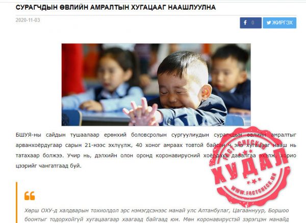 Бид энэхүү мэдээллийг Боловсрол, шинжлэх ухааны яамнаас тодрууллаа. Салбар яамнаас “Сурагчдын амралтын хугацааг наашлуулах талаар яригдаагүй. Хэрэв ийм нөхцөл байдал үүссэн бол Эрүүл мэндийн яам саналаа боловсруулж, манай яамтай зөвшилцөн Улсын онцгой комиссын хуралдаанд танилцуулдаг. ЭМЯ-наас ийм санал оруулж ч ирээгүй байна. Иргэдийн дунд санал асуулга явуулж амралтын хугацааг наашлуулах үндэсгүй. Нөхцөл байдлын мэдээлэлд үндэслэж шийдвэр гаргадаг. Амралтын хугацааг наашлуулах талаар иргэдээс санал авч байгаа болоод наашлуулахаар санал оруулж, хэлэлцүүлж байгаа гэх мэдээллүүд худал” гэв.