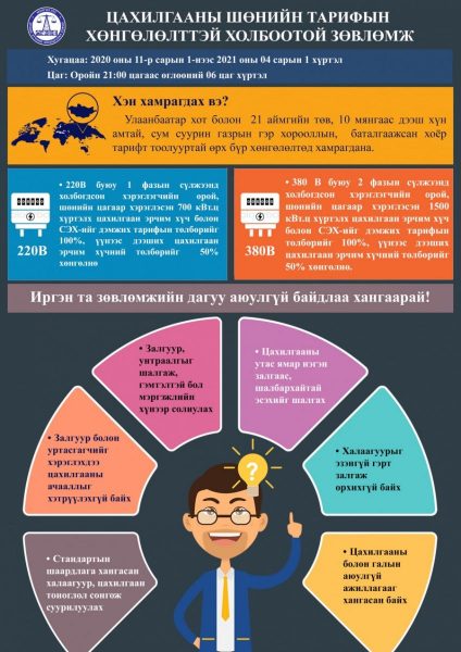 Аймгийн төв, арван мянгаас дээш хүн амтай сум суурин газрын агаарын бохирдлыг бууруулах, айл өрхөд санхүүгийн дэмжлэг үзүүлэх зорилгоор гэр хорооллын айл өрхөд цахилгаан эрчим хүчний тарифын хөнгөлөлт үзүүлэх журамд өөрчлөлт оруулан 50 хувиар хөнгөлж байсныг 100 хувиар тооцож хөнгөлөлт үзүүлэх шийдвэрийг Эрчим хүчний зохицуулах хорооноос гаргасан.