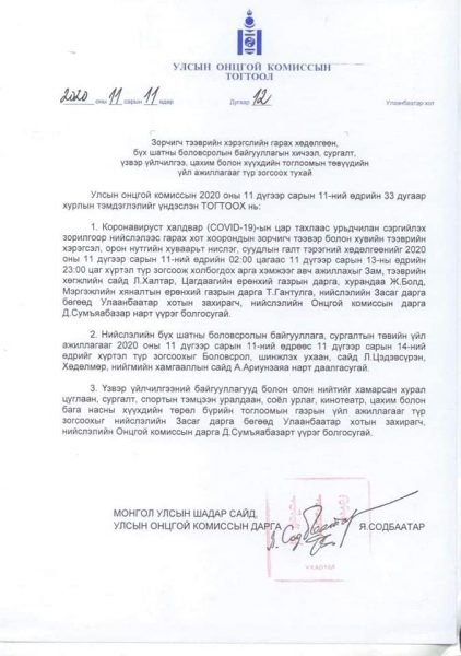 Мөн нийслэлийн бүх шатны боловсролын байгууллага, сургалтын төвийн үйл ажиллагааг 2020 оны 11 дүгээр сарын 11-ний өдрөөс 14-ний өдрийг хүртэл, үзвэр үйлчилгээний байгууллагууд болон олон нийтийг хамарсан хурал цуглаан, сургалтын, спортын тэмцээн уралдаан, соёл урлаг, кинотеатр, цахим болон бага насны хүүхдийн төрөл бүрийн тоглоомын газрын үйл ажиллагааг түр зогсоох шийдвэрийг тус тус гаргалаа
