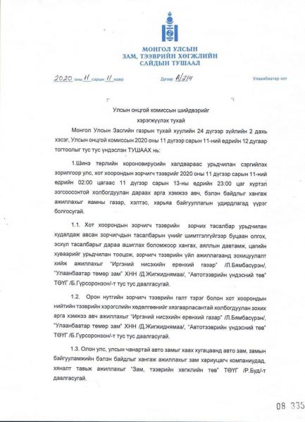 Улсын Онцгой комиссын 11 дүгээр сарын 11-ний өдрийн 12 дугаар тушаалаар коронавируст халдвараас урьдчилан сэргийлэх зорилгоор нийслэлээс гарах хот хоорондын зорчигч тээвэр болон хувийн тээврийн хэрэгсэл, орон нутгийн хуваарьт нислэг, суудлын галт тэрэгний хөдөлгөөнийг 11 дүгээр сарын 11-ний өдрийн 02:00 цагаас 11 дүгээр сарын 13-ны 23:00 цаг хүртэл түр хугацаагаар зогсоолоо.