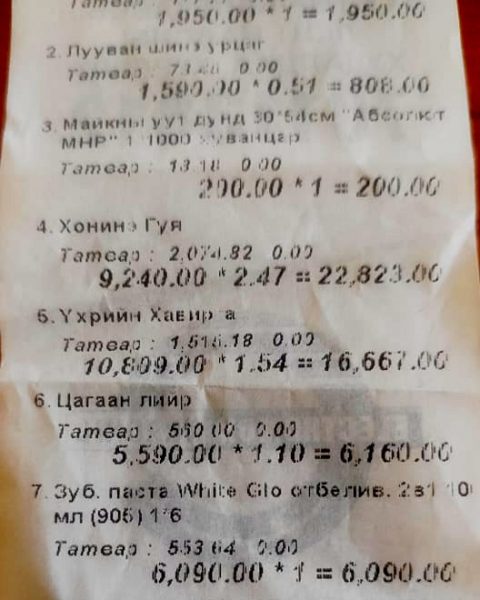 Тодруулбал, 2020 оны 11 сарын 13 ны 11 цаг 35 минутын үед АБСОЛЮТ КЭШ АНД КЕРРИ худалдааны төвөөс 2кг47 грамм хонины гуяны махыг 1кг нь 9240 төгрөг нийт 22,823 төгрөгөөр худалдан авах болжээ.