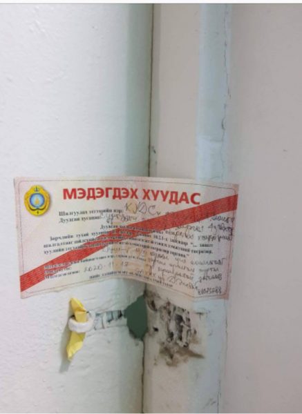 1. БГД-ийн 11 дүгээр хорооны нутаг дэвсгэрт байрлах Монголын үндэсний их сургуулийн оюутны байрны гадна орчинд хог хаягдал ихтэй хогийн цэгт хог хуримтлагдсан гамшгаас хамгаалах бүх нийтийн бэлэн байдлын үед авч хэрэгжүүлж байгаа арга хэмжээний төлөвлөгөө гаргаагүй, оюутны дотуур байрны өрөө, тасалгаа нь эрүүл ахуйн шаардлага хангаагүй, тусгаарлах өрөө гаргаагүй, хөл хорио тогтоогоогүй, хүүхдүүд гарч орох нь чөлөөтэй, өрөөнүүдийн цэвэрлэгээ хангалтгүй дотоод хяналт сул байна.