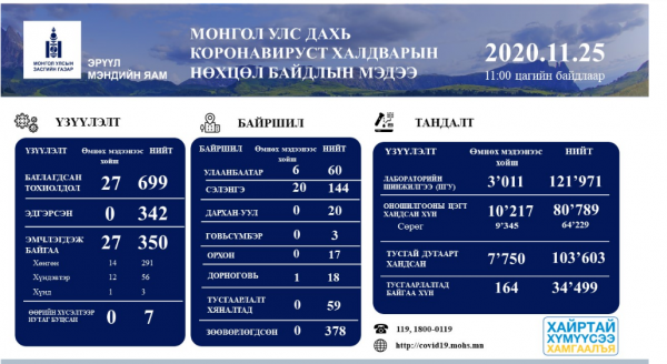 А.Амбасэлмаа: Нийт 3301 хүнд шинжилгээ хийхэд Дорноговь аймагт 1, Сэлэнгэд 20, Улаанбаатарт 6, нийт 27 тохиолдол нэмэгдэж илэрлээ. Дотооддоо 262 иргэн халдварлан голомтлоод байна. 699 иргэнээс 342 иргэн эдгэрсэн.Эмчлүүлж буй иргэдээс гурван хүний бие хүнд байгаа бол нэг хүний биеийн байдал маш хүнд, амьсгалын аппарат залгуулсан.