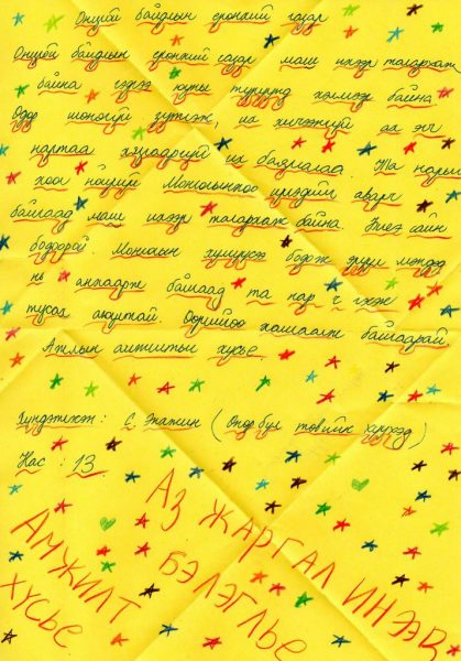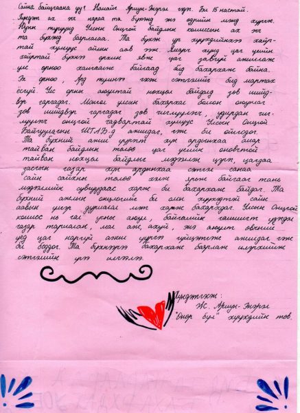 “Өнөр бүл хүүхдийн төв’-ийн хамт олон болон хүүхдүүд бүх нийтийн бэлэн байдлын зэрэгт шилжүүлсэнтэй холбогдуулан цар тахалтай тэмцэж байгаа Онцгой байдлын байгууллагын алба хаагчдад халуун аарц, чацаргана, халуун дулаан сэтгэлийн үг хайрласан захидлуудыг бичиж илгээсэн байна.