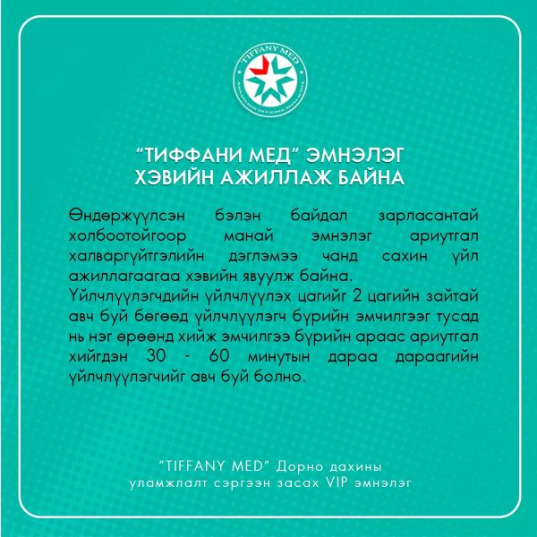 Бүх нийтийн өндөржүүлсэн бэлэн байдлын зэрэгт шилжсэн энэ өдрүүдэд Дорно дахины уламжлалт сэргээн засах “Тиффани Мед” эмнэлэг нь ариутгал халваргүйтгэлийн дэглэмээ чанд сахин үйл ажиллагаагаа хэвийн явуулж байна.