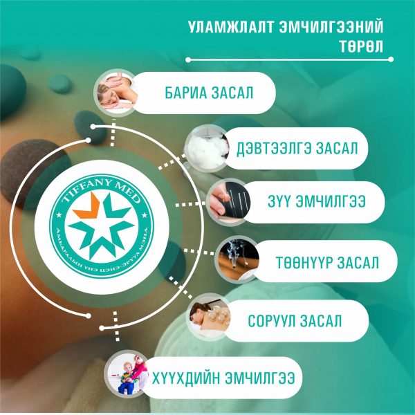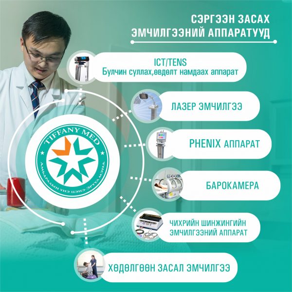Дорно дахины уламжлалт сэргээн засах “Тиффани Мед” эмнэлэг нь Монгол анагаах ухаан, Дорнын анагаах ухааны мэргэжлийн дөрвөн эмч , бариа заслын найман сувилагчтай үйл ажиллагаа явуулдаг бөгөөд эмчилгээндээ уламжлалт анагаах ухааны зүү төөнүүр,бариа засал, хануур шивүүр засал, рашаан эмчилгээ,шавар эмчилгээ, тан эмчилгээ болон дэлхий дахинд дэлгэрч буй хүний биеийн хүчил шүлт тэнцвэржүүлэгч био цахилгаан эмчилгээг нэвтрүүлэн ажиллаж байна.