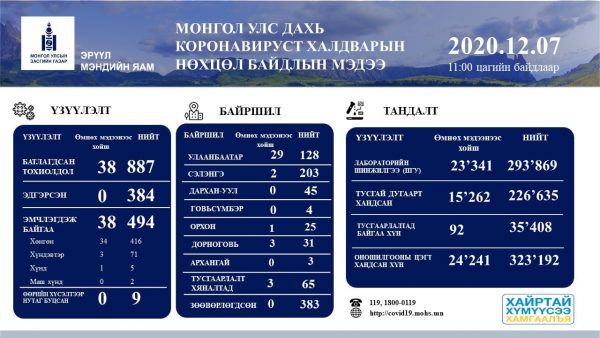 2020.12.06-ны өдрөөс хойших 24 цагийн хугацаанд ХӨСҮТ, ЗӨСҮТ, орон нутгийн 2 авто лаборатори болон Дархан-Уул, Сэлэнгэ, Орхон, Дорноговь аймгийн салбар лабораторид нийт 23.341 хүнд шинжилгээ хийхэд 38 хүнээс “Ковид-19” халдвар илэрсэн байна.