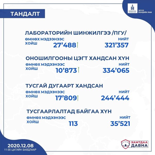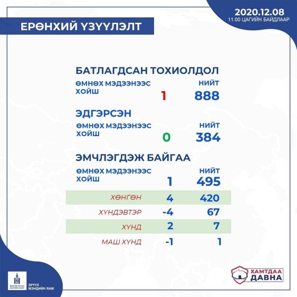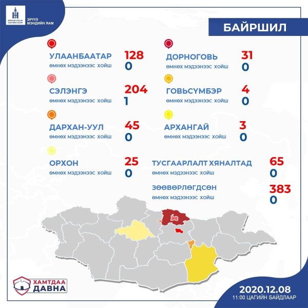 Дорноговь, Дархан-Уул, Орхон, Говьсүмбэр, Архангай аймагт сүүлийн 24 цагт нэмж халдвар бүртгэгдээгүй байна ”гэж мэдэгдлээ.