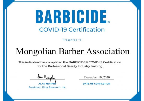 Монголын барбер, үсчдийн холбоо нь энэхүү нөхцөл байдалд бэлтгэн, олон улсын “BARBICIDE ХАЛДВАР ХАМГААЛЛЫН ДҮРЭМ КОВИД-19 ЦАР ТАХЛЫН ЭСРЭГ ХЭРХЭН АЖИЛЛАХ” Мэргэжлийн хөдөлмөрийн аюулгүйн байдал олон улсын онлайн сургалтад гишүүдээ хамруулан албан ёсны сертификатыг олгож бэлтгэлийг хангасан /https://barbicide.com/ гэдгээ мэдэгдэхэд таатай байна. Уг олон улсын сургалт, шалгалтаас бид дараах цогц мэдлэгийг олж авч, үйл ажиллагаандаа нэвтрүүлж ажиллахад бэлэн байгаа билээ.