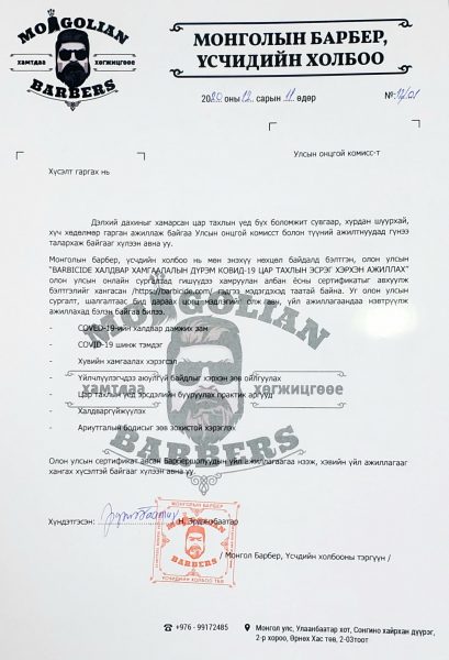 Олон улсын сертификат авсан Барбершопуудын үйл ажиллагаагаа нээж, хэвийн үйл ажиллагааг хангах хүсэлтэй байгааг хүлээн авна уу.