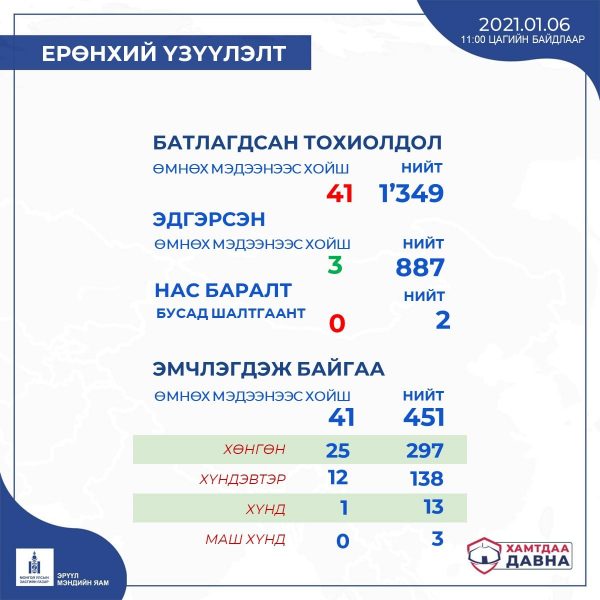ХӨСҮТ-ийн Тандалт, судалгааны албаны дарга А.Амбасэлмаа“ 2021 оны 01-р сарын 05-ны өдөр нийт 16.377 хүний сорьцонд PCR-ийн шинжилгээ хийхэд 41 хүнд коронавируст “Ковид-19” халдвар илэрлээ.
