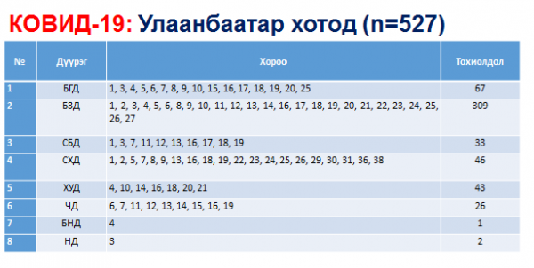 Баянзүрх дүүргийн нэгдсэн эмнэлгийн үүссэн голомттой холбоотойгоор гэр бүлийн болон дам хавьтлуудын тусгаарласан хүмүүсээс бусад тохиолдлууд илэрсэн байна.