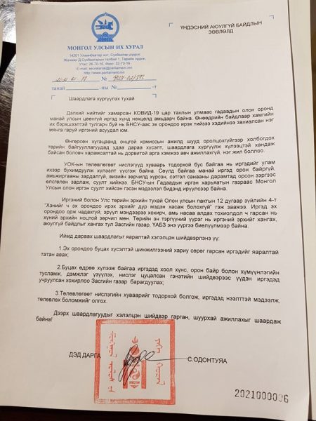 УИХ-ын дэд дарга С.Одонтуяа өнөөдөр /2021.01.18/ Төрийн ордон мэдээлэл хийлээ. Тэрбээр гадаадад гацсан, эх орондоо ирж чадахгүй байгаа иргэдийн эрхийг хамгаалж, Үндэсний аюулгүй байдлын зөвлөлд албан шаардлага хүргүүлжээ.