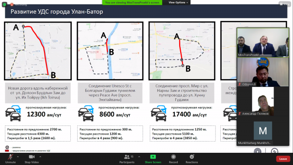 Нийслэлийн Зам, тээврийн асуудал хариуцсан төслүүдийн удирдагч Б.Одсүрэнгээр ахлуулсан нийслэлийн холбогдох байгууллагын удирдлагууд Москва хотын Засгийн газрын харьяа “МосТрансПроект” Нийтийн тээврийн эрдэм шинжилгээ, зураг төслийн хүрээлэнтэй 2021 оны 01 дүгээр сарын 26-ны өдөр “Улаанбаатар хотын авто замын түгжрэлийг бууруулах асуудлаар хамтарч ажиллах” нь сэдвийн хүрээнд цахимаар хуралдлаа.