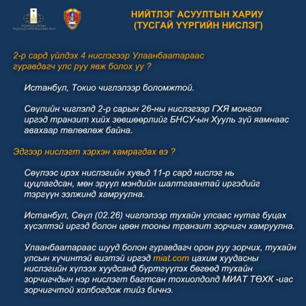 Истанбул, Сөүл /2021.02.26/ чиглэлээр тухайн улсаас нутаг буцах хүсэлтэй иргэд болон цөөн тооны транзит зорчигч хамруулна.