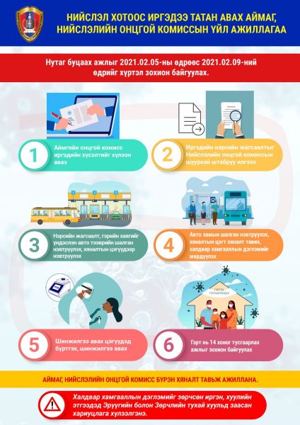 Иймд, нийслэл, аймаг, орон нутгийн Онцгой комисс ямар ажлуудыг зохион байгуулах, иргэд хаана хандаж, ямар шинжилгээ, бичиг баримт бүрдүүлсэн байх талаарх дэлгэрэнгүй мэдээллийг доорх инфографикаас хүлээн авна уу.