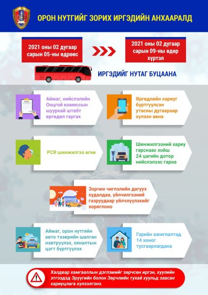 Улсын онцгой комиссын шийдвэрээр Улаанбаатар хотод гацсан орон нутгийн иргэдийг нутаг буцаах ажлыг сар шинийн өмнө буюу 02 дугаар сарын 05-ны өдрөөс 09-ний өдрийг хүртэл хугацаанд зохион байгуулахаар болсон.