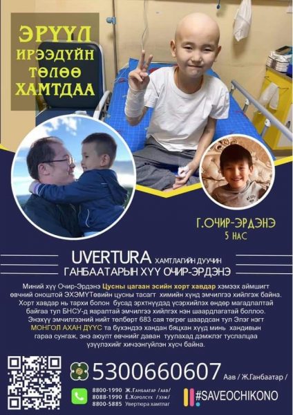 Сэргэлэн цовоо Г.Очир-Эрдэнэ 5 настай. Бяцхан хүүгийн эмчилгээний зардлыг цуглуулахад өөрийн хувь нэмрээ оруулж нэгэн гэр бүлийг элэг бүтэн байлгах гайхамшгийг бүтээх үйлсэд манай хамт олон нэгдэж байна.