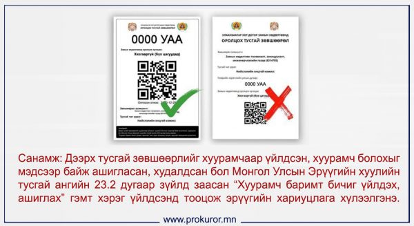 Иргэд QR кодыг хуурамчаар үйлдэн, ашиглаж байгаа үйлдлээ энгийн жижиг зүйл мэт ойлгож байгаа ч энэ нь эрүүгийн хариуцлага хүлээх хүртэл хэмжээнд үр дагаварт хүргэнэ гэдгийг ухамсарлах хэрэгтэй. Улсын онцгой комисс 2021 оны 2 дугаар сарын 11-ний өдрийн 06.00 цагаас 2 дугаар сарын 23-ны өдрийн 06.00 цаг хүртэл нийслэлд Гамшгаас хамгаалах бүх нийтийн бэлэн байдлын зэрэгт хэсэгчилсэн байдлаар шилжих шийдвэр гаргасан. Энэ үед иргэд замын хөдөлгөөнд оролцох зорилгоор аливаа тусгай зөвшөөрөл, албаны үнэмлэх зэрэг баримт бичгийг хуурамчаар үйлдэхгүй байхыг Хан-Уул дүүргийн прокурорын газраас сэрэмжлүүлж байна.