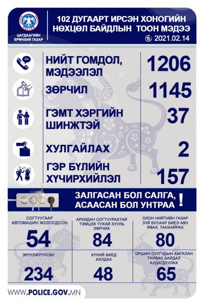 Цагдаагийн байгууллагад өчигдөр /2020.02.14/ нийт 1206 гомдол, мэдээлэл иржээ. Үүнээс зөрчлийн дуудлага 1145 байсан бол гэр бүлийн хүчирхийллийн дуудлага 157,  хулгайлах гэмт хэрэг хоёр, гэмт хэргийн шинжтэй 37 үйлдэл бүртгэгдсэн аж.