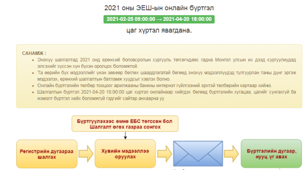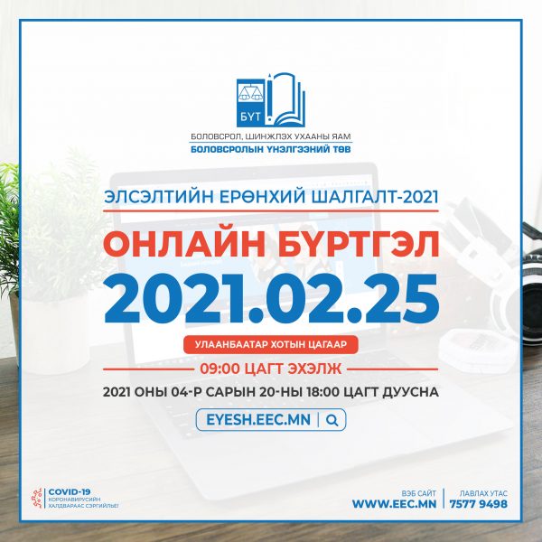 Элсэлтийн ерөнхий шалгалтын онлайн бүртгэл www.eec.mn цахим хуудсаар, орон даяар, Улаанбаатар хотын цагаар 2021 оны 02 дугаар сарын 25-ны 09:00 цагт эхэлж, 2021 оны 04 дүгээр сарын 20-ны 18:00 цагт дуусна.