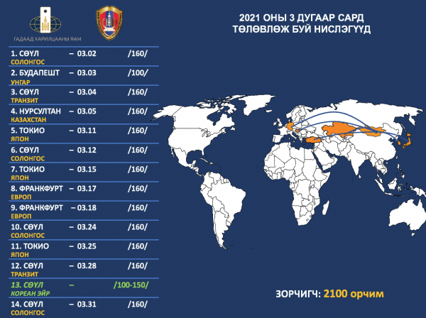 Үүний ихэнх нь буюу 4521 нь БНСУ-д байгаа иргэд юм байна. Ирэх саруудад буюу гурав, дөрөвдүгээр сард чартер нислэгийн тоог нэмэгдүүлж сард 14 доошгүй удаа нисгэж, сард дунджаар 2000 гаруй иргэдийг татан авахаар төлөвлөж байгаа юм байна.
