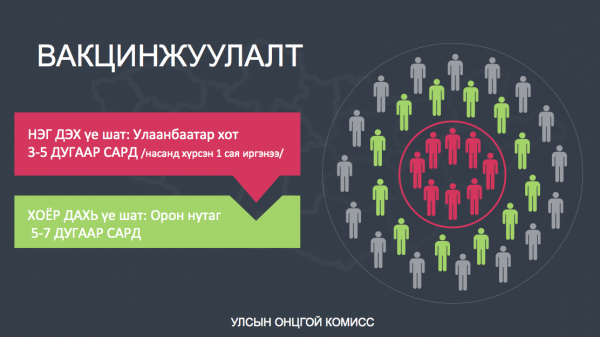 Засгийн газар, Улсын онцгой комисс дархлаажуулалтыг хоёр шаттай хийхээр төлөвлөөд байна. Эхний ээлжинд буюу 3-5 дугаар сард халдварын голомтууд идэвхтэй байгаа Улаанбаатар хотын насанд хүрсэн нэг сая иргэнийг дархлаажуулна.