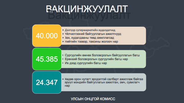 Үүнд томоохон зах, худалдаа, үйлчилгээний газруудад ажиллаж байгаа 40 мянган хүн, боловсролын бүх шатны байгууллагын 45 мянга гаруй багш, ажилчин юуны өмнө хамрагдах юм.