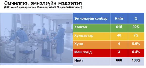 Өнөөдрийн байдлаар нийт 668 хүн эмчлэгдэж байгаагаас биеийн байдал нь хөнгөн 615, хүндэвтэр 46, хүнд 4 , маш хүнд 3 хүн байна.