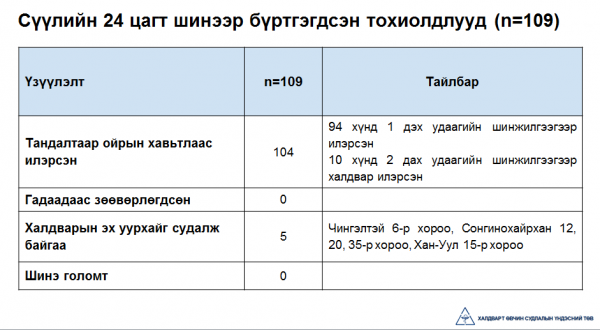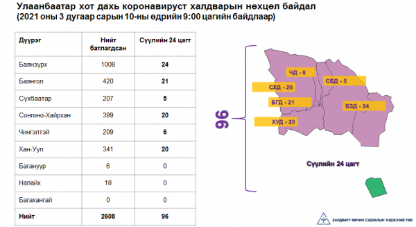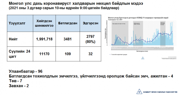 ХӨСҮТ-ийн Халдварын тандалт, судалгааны албаны дарга Ж.Байгалмаа “Сүүлийн 24 цагт 11,170 хүнд коронавирусийн халдвар илрүүлэх шинжилгээний хийхэд 109 хүнээс халдвар илэрсэн. Ингэснээр нийт халдварын тоо 3,481 болж байна. Сүүлийн 24 цагт зөөвөрлөгдсөн тохиолдол бүртгэгдээгүй. Шинээр батлагдсан 109 тохиолдлын 104 нь халдвартай хүмүүсийн хавьтал бол таван хүний халдварын эх уурхайг тогтоох тандалтын үйл ажиллагаа явагдаж байна.