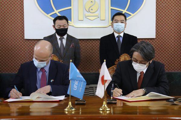 Япон Улсын Засгийн газрын буцалтгүй тусламжийн хүрээнд НҮБ-ын Хүүхдийн сан (UNICEF)-аар дамжуулан Монгол Улсад хэрэгжүүлэх “КОВИД-19 цар тахал болон нийгмийн эрүүл мэндийн онцгой байдлын үеийн чадавхийг бэхжүүлэх төсөл”-ийн солилцох ноот бичигт гарын үсэг зурах ёслолын ажиллагаа өнөөдөр Гадаад харилцааны яаманд болов.