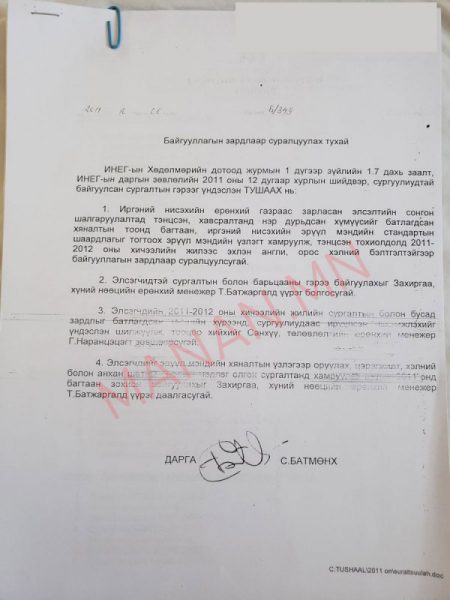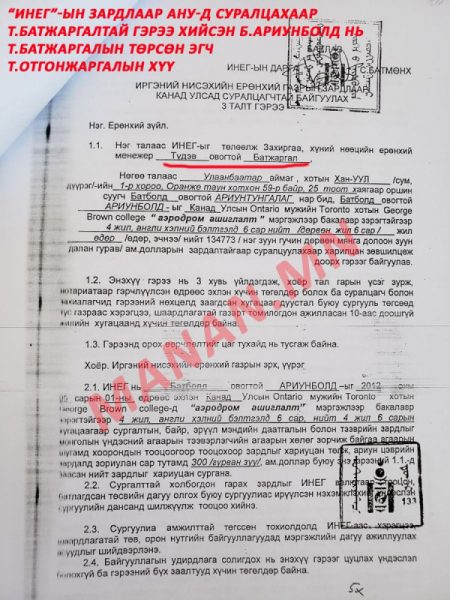 Үүнээс төрсөн эгч Т.Отгонжаргалын хүү Б.Ариунболд нь өөрийн буруугаас хэлний бэлтгэлээ дүүргэж үндсэн ангидаа орж чадаагүй байж байгаад 4 жилийн дараа үндсэн ангидаа орох хүсэлт гаргахад нь байгууллагын зүгээс татгалзсан хариу өгөхөд тэрээр шүүхэд хандсан байдаг. Харин эсрэгээрээ өмнө нь байгууллагаас гаргасан зардлыг Б.Ариунболдоор буцааж төлүүлэхээр болсон байна. Гэтэл одоог хүртэл төлөөгүйгээр барахгүй гэрээний барьцаанд байсан орон сууцыг чөлөөлүүлэх луйврийг Т.Батжаргал дотроос нь хийжээ.