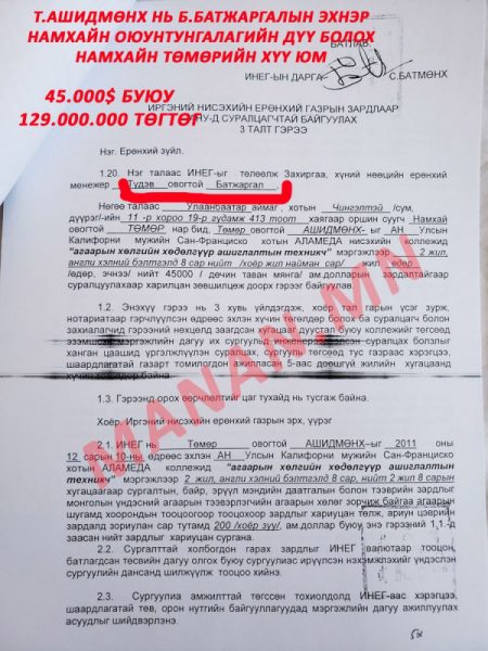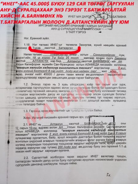 - Т.Батжаргалын жолооч Д.Алтансүхийн хүү А.Баянмөнхийг мөн Санфранциско хотод тус, тус байгууллагын зардлаар (тус бүр 45.000$) суралцуулах гэрээг Т.Батжаргал өөрөө байгуулжээ. Уг гэрээнд оюутан тус бүрт сар бүр ариун цэврийн хэрэгслийн зардалд 200$ төсөвлөхөөс эхлээд бүх зардлыг байгууллагаас гаргуулахаар тусгасан байна.