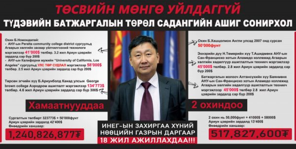 Эрх мэдэлтнүүд албан тушаалаа амин хувьдаа урвуулан улсын төсөв дээр ийнхүү тонгочиж байхад эгэл ардууд гэр бүлээсээ нэг хүүхдээ дотооддоо боловсрол эзэмшүүлэхийн төлөө зээлийн барьцаанд орж биесээ дуустал хөдөлмөрлөж байна. Энгийн нэг айлын хүүхдүүдэд хагас тэрбум төгрөгийг улсын төсвөөс төлүүлээд гадаадад боловсрол эзэмших ийм боломж олдохгүй. Яагаад гэвэл аав нь Т.Батжаргал шиг эрх мэдэлтэн, намчин биш болохоор.