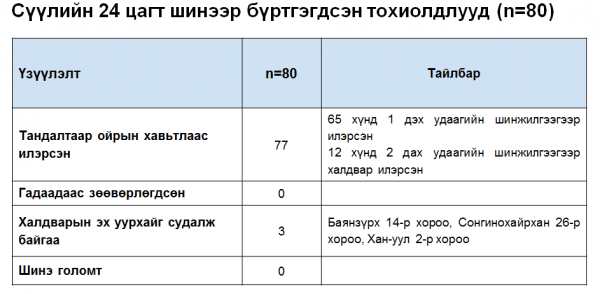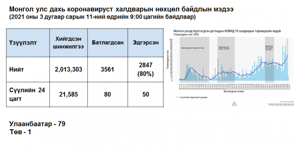 Өнгөрсөн 24 цагт 21185 хүний сорьцод өчигдөр шинжилгээ хийхэд 80 хүнээс “Ковид-19” илэрч, 21 хоног эмчилгээ хийлгэж байсан халдвартай 1 иргэн нас барсан байна. Тухайлбал, 21 хоног эмчилгээнд байсан 76 настай эмэгтэй 20 хоног эрчимт эмчилгээнд эмчлүүлж байгаад халдвар нь уушгины хатгалгаа болон хүндэрчээ.