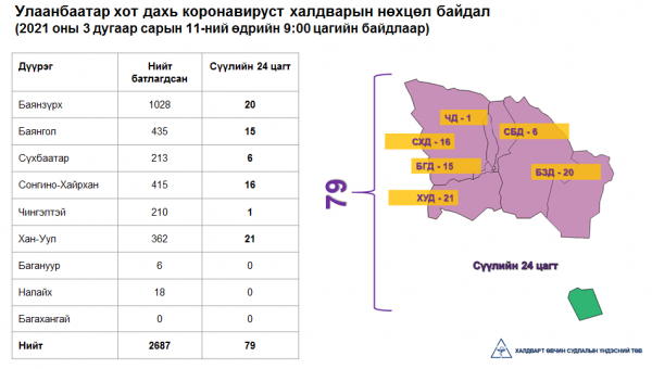 ХӨСҮТ-ийн дэд захирал Э.Тэмүүлэн:Батлагдсан тохиолдлуудаас зөөвөрлөгдсөн тохиолдол байхгүй. Улаанбаатарт халдварын 79 шинэ тохиолдол батлагдаж, 1 тохиолдол Төв аймагт бүртгэгдлээ. Монгол Улсад бүртгэгдсэн нийт тохиолдол 3561 болж, нийт халдвар авсан иргэдийн 80% нь эдгэрсэн.