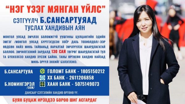 Сайхан сэтгэлт хүмүүн та цэл залуу, ид хөдөлмөрлөж, хийж бүтээх насандаа ховор тохиолдох хүнд өвчнөөр өвдсөн найзад минь Б.Сансантуяа Голомт банк 1805150212, Худалдаа хөгжлийн банк 2611206858 дансаар сэтгэлийн хандив өргөнө үү. Мөн таны худалдан авсан нэг үзэг найзын минь эмчилгээнд үнэтэй хувь нэмэр оруулах болно.Та бүхэн үзэг худалдан авахыг хүсвэл 95244812 дугаараар холбогдож хүргүүлэн аваарай.