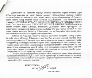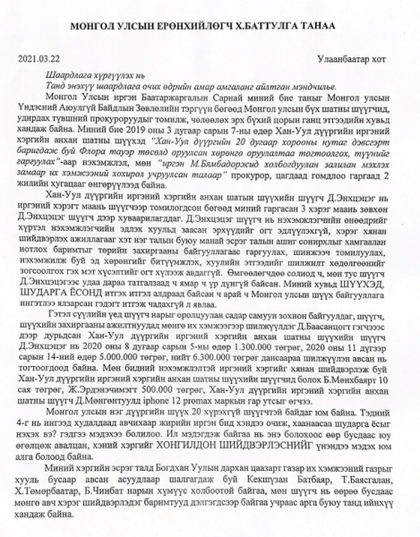 Тэд “хонгилын шүүгчдэд” мөнгө тараадаг, өмгөөлөгч Д.Баасанцогтоос 6,3 сая төгрөг дансаар авсан нь ил болсон, ХУД-ийн анхан шатны шүүхийн шүүгч Д.Энхцэцэгийн бүрэн эрхийг түтгэлзүүлэн шалгаж өгөхийг шаардсан 48 цагийн хугацаатай шаардлагыг Ерөнхийлөгч Х.Баттулгад өгөхөөр иржээ.