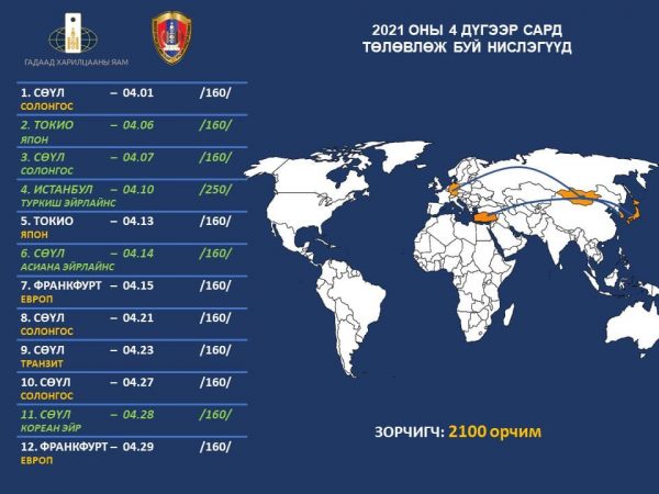 Улсын Онцгой комиссын шийдвэрийн дагуу ирэх дөрөвдүгээр сард нийт 12 удаагийн тусгай үүргийн нислэг үйлдэж, 2100 орчим иргэнээ татан авахаар төлөвлөөд байна.