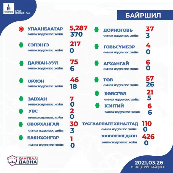 Коронавируст халдвар (covid-19)-ын нөхцөл байдлын өнөөдрийн /2021.03.26/ 11:00 цагийн нэгдсэн мэдээллээр ХӨСҮТ-ийн Тандалт судалгааны албаны дарга Ж.Байгалмаа мэдээлэл хийлээ.