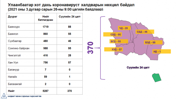 Шинээр батлагдсан 437 тохиолдлын 370 нь Улаанбаатар хотод бүртгэгдэж, нийслэлийн нийт халдварын тоо 5287 болсон байна. Харин аймаг орон нутагт 67 тохиолдол илэрч орон нутгийн нийт өвчлөл 509 боллоо.