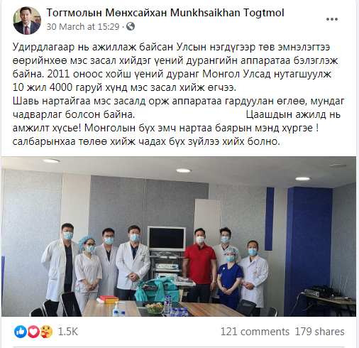 Дэлхийн эмч нарын өдрийг тохиолдуулан Эрүүл мэндийн сайд асан Т.Мөнхсайхан Улсын нэгдүгээр төв эмнэлгийн Хэрх үе судлал, Үе сэргээх төвийн хамт олонд үений дурангийн мэс заслын аппарат, тоног төхөөрөмж хандивлажээ.