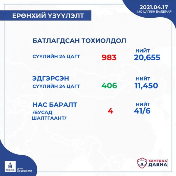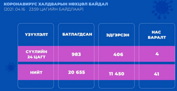 ЭМЯ-ны хэвлэлийн төлөөлөгч Б.Ууганбаяр“Улсын хэмжээнд 24 цагт 13635 хүнд коронавируст халдвар илрүүлэх шинжилгээ хийхэд 983 хүнээс коронавируст халвар илэрлээ. Ингэснээр Монгол Улсын нийт батлагдсан тохиолдол 20655 боллоо.Сүүлийн 24 цагт 406 хүн эдгэрсэн ингээд нийт эдгэрсэн хүний тоо 11,450 боллоо.