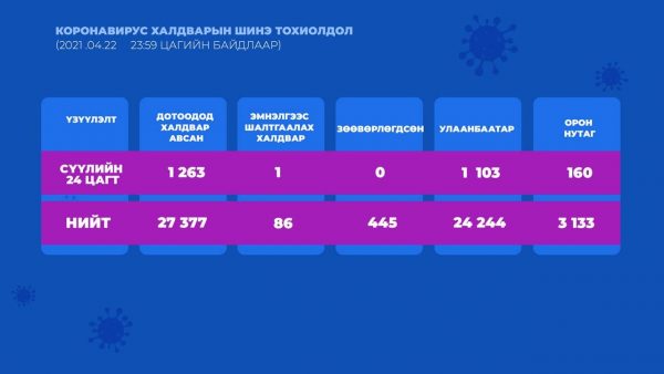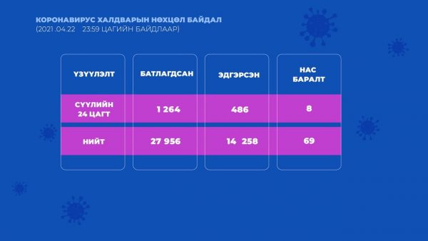 Улаанбаатар хотод 1103, хөдөө орон нутагт 160 тохиолдол бүртгэгдлээ. 8 хүн нэн хүнд хэлбэрээр нас барлаа. 66 настай эрэгтэй, 57 настай эрэгтэй, 94 настай эрэгтэй, 81 настай эрэгтэй, 60 настай эрэгтэй, 56 настай эмэгтэй, 62 настай эрэгтэй, 62 настай эмэгтэй нас барлаа.