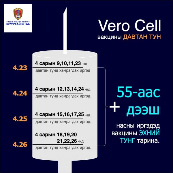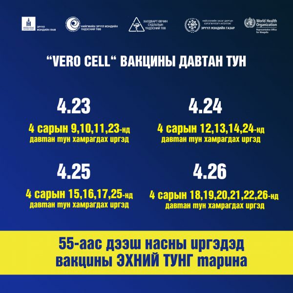 Мөн энэ дөрвөн хоногийн хугацаанд 55-аас дээш насны дархлаажуулалтад хамрагдах иргэд “Синофарм” компанийн “ВероСелл” вакцины эхний тунгаа хийлгэх боломжтой.