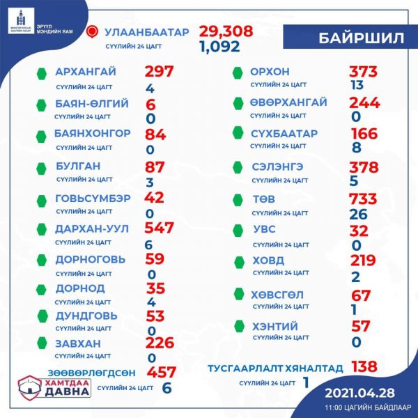 Коронавируст халдвар (covid-19)-ын нөхцөл байдлын өнөөдрийн /2021.04.28/ 11:00 цагийн мэдээллийг ЭМЯ-ны хэвлэлийн төлөөлөгч Б.Ууганбаяр өглөө.