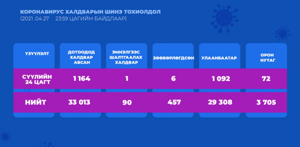 ЭМЯ-ны хэвлэлийн төлөөлөгч Б.Ууганбаяр:Сүүлийн 24 цагт улсын хэмжээнд 11381 хүнд шинжилгээ хийхэд 1171 хүнд коронавируст халдвар илэрлээ. Ингэснээр Монгол Улсын хэмжээнд нийт батлагдсан халдварын тохиолдол 33608 болсон байна.