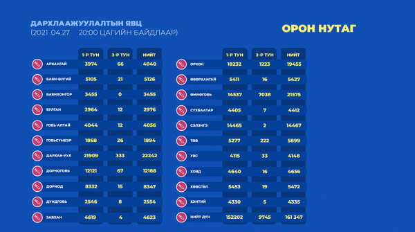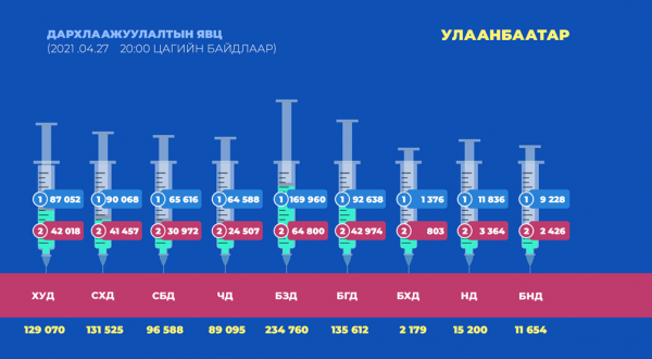 -Вакцинжуулалт хэвийн үргэлжилж байна. 592600 гаруй хүнийг нэгдүгээр тунд хамрууллаа. Үүнээс 253 мянга нь бүрэн тунгаа хийлгэсэн. Нэгдүгээр тунд хамрагдах иргэдэд харьяа өрх дүүргээс нь залгаж мэдэгдэнэ.