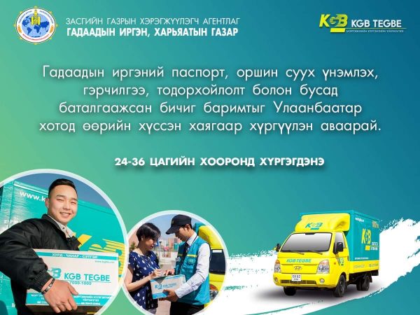 Гадаадын иргэн, харьяатын газар коронавирусийн халдвараас урьдчилан сэргийлэх, төрийн үйлчилгээг иргэдэд шуурхай хүргэх зорилгоор Кэй Жи Би Тэгбэ хүргэлтийн компанитай хамтран ажиллах гэрээ байгуулж, гадаадын иргэний баримт бичгийг баталгаат шуудангаар хүргэхээр боллоо.